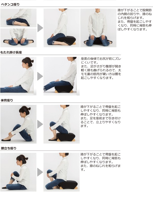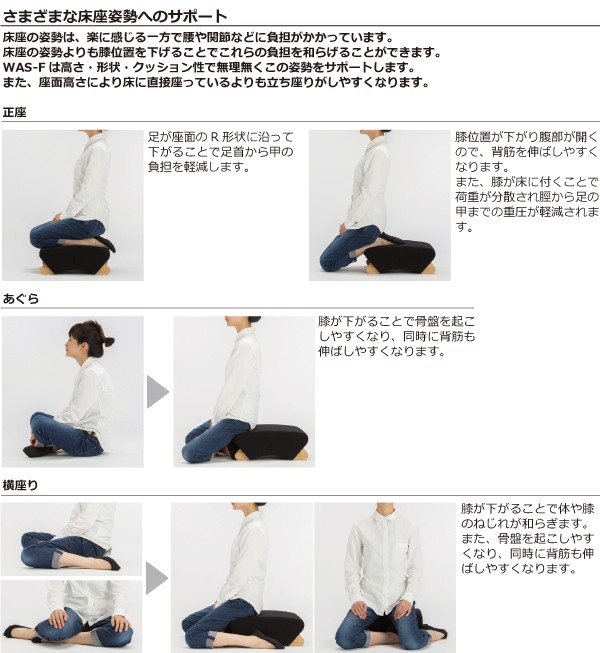 床座の姿勢よりも膝位置を下げることでこれらの負担を和らげることができます。WAS-Fは高さ・形状・クッション性で無理無くこの姿勢をサポートします。