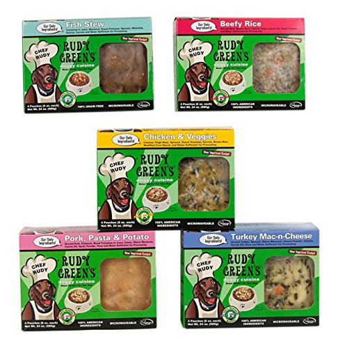 -. Binding : Misc. -. Brand : Rudy Greens Doggy Cuisine -. EAN : 0851872005057 -. Feature : Cooler case contains 5 boxes of Rudy Green's, each with four 6-oz pouches that can be thawed in warm water in minutes / A great way to add nutrition and variety to a dry diet / Perfect for sick or older dogs as a delicious and healthful meal / Simple, limited ingredients make it good for dogs with allergies or to hide medications / Low calorie and nutrient dense for overweight dogs on restricted intake -. Label : Rudy Green Ventures - DROP SHIP -. Manufacturer : Rudy Green Ventures - DROP SHIP -. Model : Variety Pack -. MPN : Variety Pack -. PackageQuantity : 1 -. PartNumber : Variety Pack -. ProductGroup : Pet Products -. ProductTypeName : PET_SUPPLIES -. Publisher : Rudy Green Ventures - DROP SHIP -. Size : One Size -. Studio : Rudy Green Ventures - DROP SHIP -. Title : Rudy Greens Doggy Cuisine Variety Pack Dog Food, One Size -. UPC : 851872005057