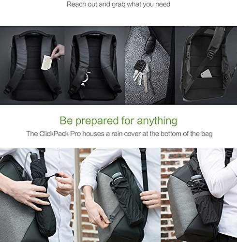 Korin Design | ClickPack Pro | The Best Functional Anti-theft Backpack? 1. Security ? Triple anti-theft protection ? Retractable, metal wire lock ( maximum bearing strength =<50KG) ? YKK double player explosion proof zipper? ? Special Slash Resistant Fabric (60% polymer polyethylene fabric | 30% black ultra-fine industrial-level polyester silk | 10% military level glass fiber). Cut resistant level 4 ? Comes with rain cover and carrying bag 2. Storage ? Five major storage compartments for pratical pocket-separation ? A dedicated space for Laptop up to 15.6" ? A dedicated space for iPad up to 10" Reasonale configuration of the storage space 3. Convenience 4. Comfort ? Unique weight reduction System? ? Wrap-around shoulder strap helps to relief the weight on your shoulder ? Back support - hugs your back reduce and evenly distribute weight on your back? 5. Design ? Custom bi-metallic zippertested over 1000 times to ensure a long lasting and smooth seal ? Spliced, high-density polyester fiber, more comfort and more load bearing 6. Dimension | Weight | Color ? Size - 18.1in x 13.4in x 6.3in ? Net weight - 2.2lbs ? Color - Gray 0 |