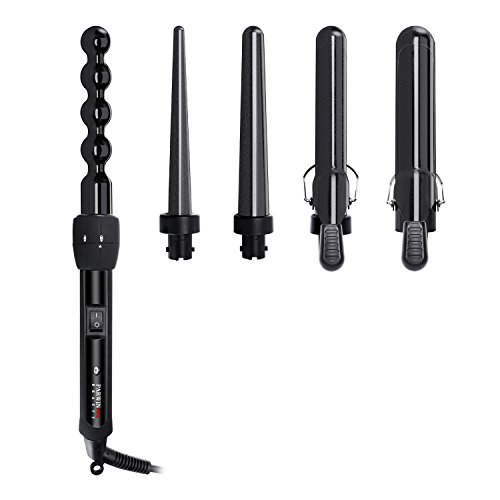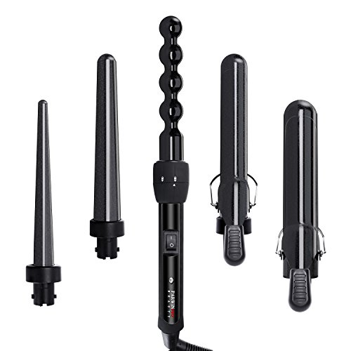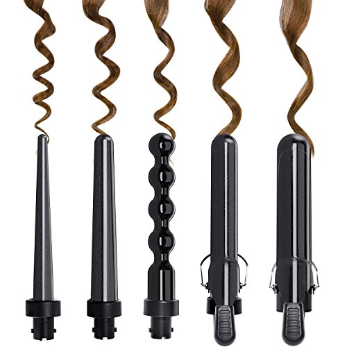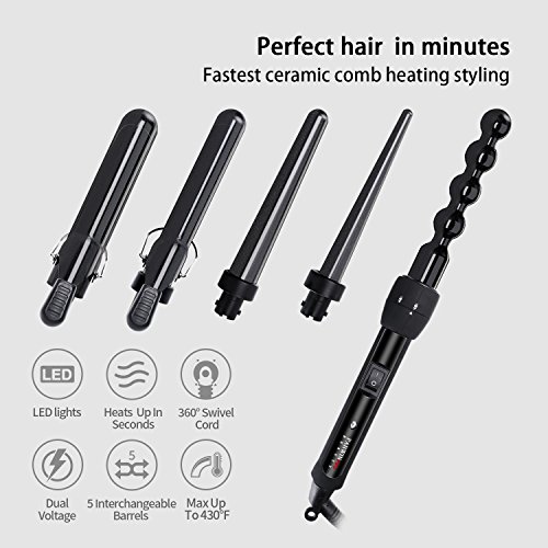 SAMRT FEATURES: This curling iron set is designed with a 60 minute auto shut off function, 5 interchangeable ceramic barrels (0.3 to 1.25 inches),quick heating technology,dual voltage 110-240V,360º swivel cord (8 ft),Includes heat-resistant glove and beautiful travel bag