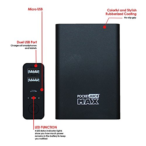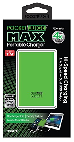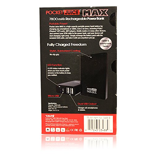-. Binding : Wireless Phone Accessory -. Brand : Tzumi -. Feature : Pocket Juice External Battery Backup 7800 mAh rechargeable battery allows is a dual USB charger that can provide up to 4 charges per re-charge / Dual USB Output 2.1 A output for Turbo charging / Power bank includes Micro USB cable, 2 USB ports and 2.1A output / 4 LED status indiciator lights to show you how much power remains in the battery / Compatible with iPhones, Samsung Galaxys, Androids, tablets and other mobile devices -. Label : Tzumi -. Manufacturer : Tzumi -. PackageQuantity : 1 -. ProductGroup : Wireless -. ProductTypeName : WIRELESS_ACCESSORY -. Publisher : Tzumi -. Studio : Tzumi -. Title : Tzumi Pocket Juice External Battery Pack 7800 mAh/2.1A Output Portable Power Bank Dual USB Charger Compatible with iPhones, Samsung Galaxys, Androids, Tablets and other Mobile Devices