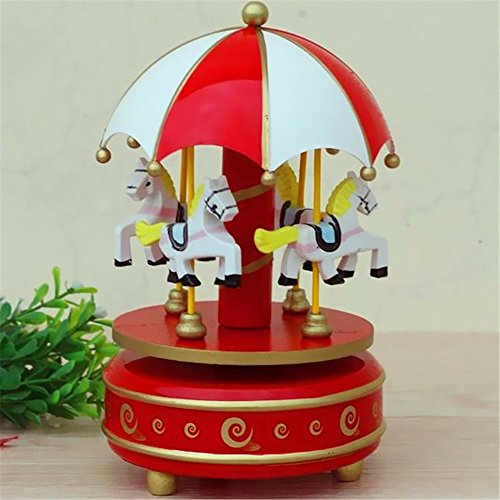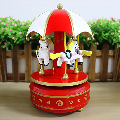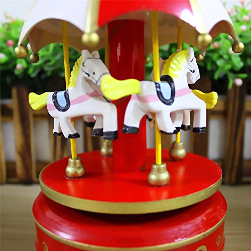 GoodPlay the Top of Umbrella Shaped Carousel Wooden Music Box Rainbow Wooden 4 Horses Rotating Music Box Birthday Valentine's Christmas Children Gifts Toy (Red White & Red)