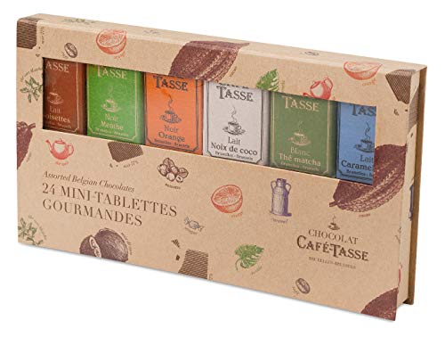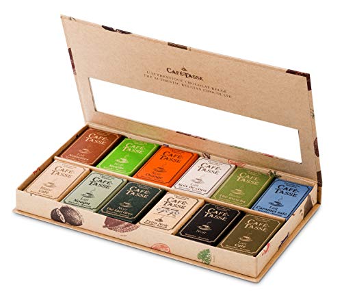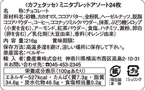 原材料:砂糖、カカオマス、ココアバター、全粉乳、ヘーゼルナッツ、脱脂ココアパウダー、コーヒー、ココナッツミルクパウダー、抹茶、ぶどう糖シロップ(小麦を含む)、アーモンド、紅茶パウダー、食塩、ハチミツ、澱粉、卵白(卵を含む)/乳化剤(大豆由来)、香料(オレンジ由来)