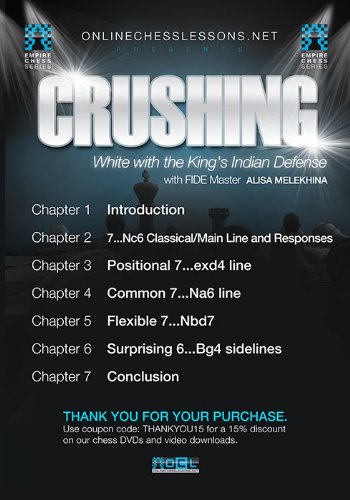 Studio : Empire Chess Publisher : Empire Chess Binding : DVD Product Description FM Alisa Melekhina provides a comprehensive overview of alternatives to the main line of the KID, demonstrating the opening's viability. She uses a clear structure of dividing the alternatives between the typical attacking and more position exd4 lines. Within that structure, she suggests ways to harness the 7. ..Na6 or 7. ..Nbd7 sidelines to adapt to White's play and choose which of the two modes of the KID to play. Rather than focusing on rote memorization, the commentary highlights key plans, structures, and themes that are applicable across the various lines. The video provides a roadmap in which to explore which KID line suits your style. The content is ideal for the intermediate player who is disenchanted with the classical lines of the KID, yet is drawn to its structures and dynamic play. It is also fitting for a player looking to choose a new and simple line against 1. d4. 0