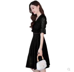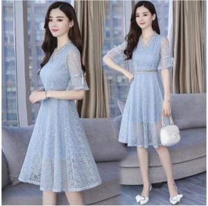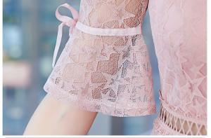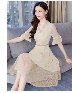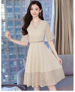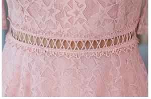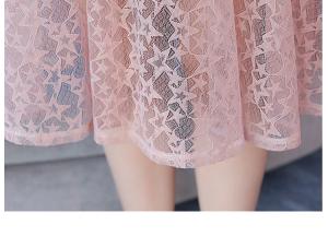 星柄レースワンピース Vネック ハイウエスト フレア袖 総レース 膝丈 ひざ下丈 プチプラ 半袖 上品