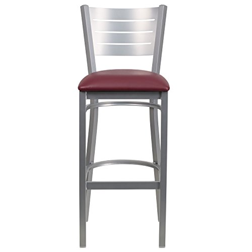 -. Feature : Heavy Duty Restaurant Bar Stool / Slat Style Back / Burgundy Vinyl Upholstered Seat / 2.5'' Thick 1.4 Density Foam Padded Seat / 18 Gauge Steel Frame