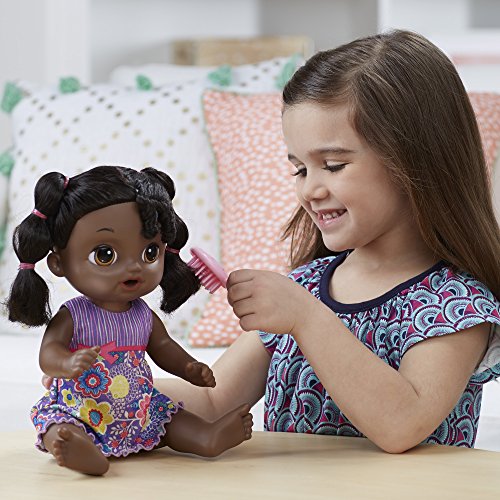 A sick baby needs lots of love to bounce back to their normal smiles and giggles. Kids can nurture the Sweet Tears Baby doll to help her back to health. First, fill her "juice" box with water to feed her. . .oh no! She cries tears that mommy or daddy can wipe away. The Sweet Tears Baby doll has an expressive face and responds to her accessories. Kids can give Sweet Tears Baby doll a check-up with the stethoscope and thermometer. Her nose lights up to let kids know she needs her tissue. Pretend to blow her nose or bandage a pretend boo-boo. Flip the switch in her back to choose who she's speaking to -- she says "Mommy" and "Daddy" so girls and boys can play out nurturing moments. With 35 plus sounds and phrases in English or Spanish, she can tell kids how she's feeling. . .and that she loves them! Baby Alive and all related properties are trademarks of Hasbro.Feature