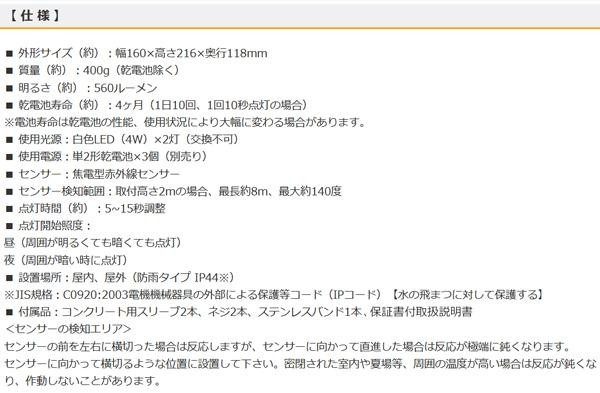 センサー左右角度、昼夜ツマミで夜だけ点灯もしくは昼も感知点灯、点灯時間(5~15秒)の調整ができます。前面電池ボックスなので、設置したまま簡単に電池交換ができます。 製造国:中国 仕様:保証期間:1年間 ※サプライヤー直送品 ご注文後2~3営業日後の出荷となります【商品名】オーム電機 OHM E-Bright 乾電池式4W×2灯 LEDセンサーライト LS-B285B-K