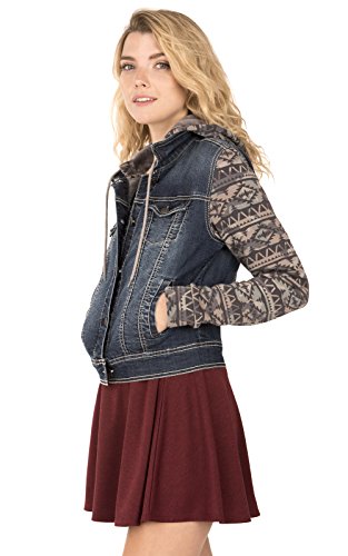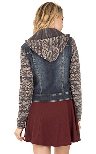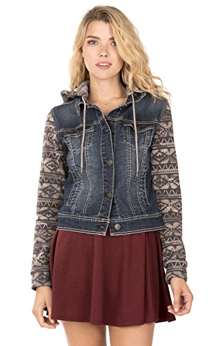 Product DescriptionClassic denim jacket is layered with knit sleeves and hoodie.0