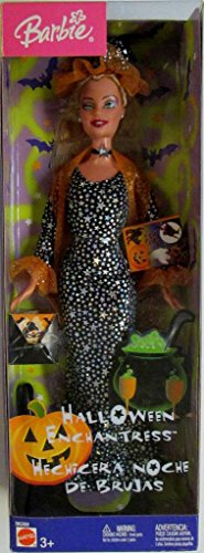 - This Halloween Enchantress Barbie is dressed in a long black dress and witch type hat with glittery stars all over it and trimmed in orange sheer fabric.