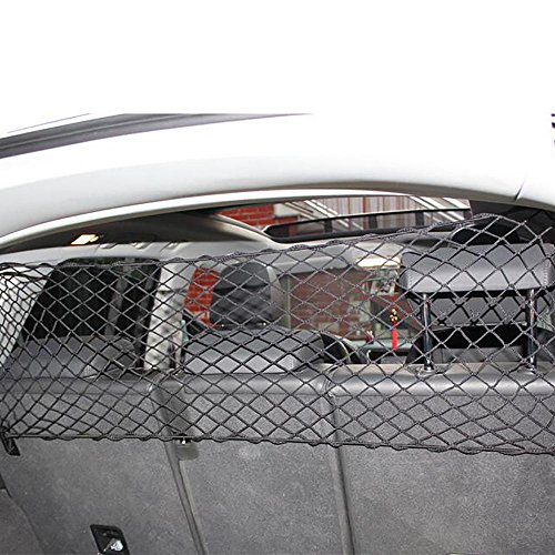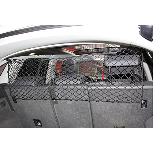 -. Feature : Net Barrier Fits most cars//trunks/SUV. / Keep your pet at the back and make your drive safe. Durable see through mesh, pet's claws won't get caught. / Many pets likes steps over it onto the console,with the car back seat barrier,keeps pets from launching into front seat. / Durable and long lasting, strong hook in bungee cords is not easily deformed, protective cover designed won't hurt the dogs. / Easy to Install and Remove: The net barrier is easy to Install and remove with hooks and adjustable strips. Can be attached either to the handles above the door or the front seat headrests.