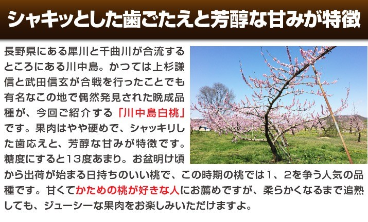 | 保存方法、お召し上がり方 | 常温で保存。 固めが好きな方は到着後すぐにお召し上がりください。少々かたいと感じられる場合は、風通しの良い直射日光が当たらない常温の場所に数日保存して頂くと柔らかくなります。 お召し上がりの1時間ほど前に冷蔵庫にいれて、冷やしていただくと美味しく召し上がれます。(長時間冷やし過ぎると桃の糖度が下がってしまいます) |