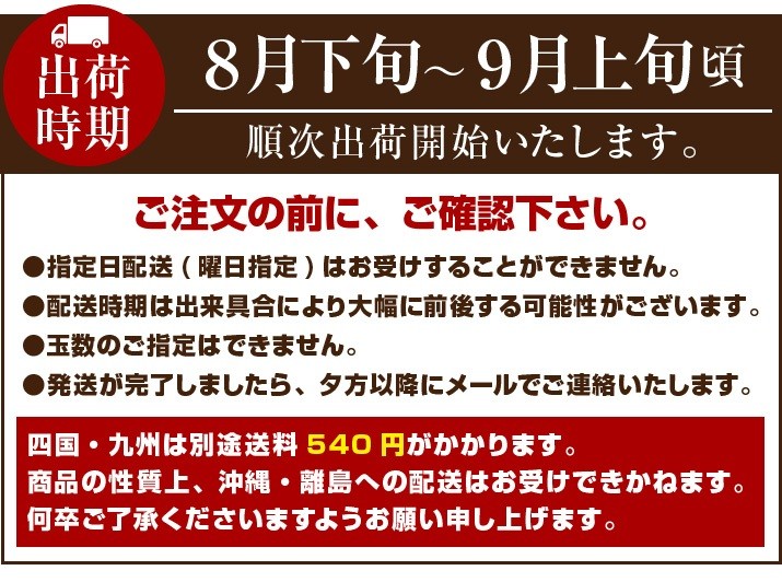 | お届け時期 | 出荷予定は8月下旬頃から9月上旬頃まで。注意 ※この商品は日付指定が出来ません。出荷後にメールで到着日をお知らせいたします。 |