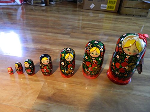 -. Feature : set of 7 wooden hand painted russian nesting dolls / main colors are red, black & green with some gold & white accents / largest doll stands 8" tall / base of doll is 4" diameter / made in RUSSIA