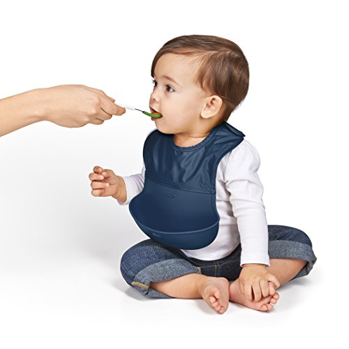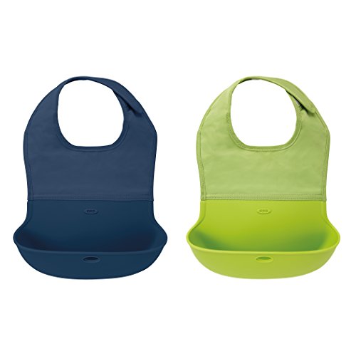 OXO Tot Waterproof Silicone Roll Up Bib with Comfort-Fit Fabric Neck, 2 Pack, Navy/Green