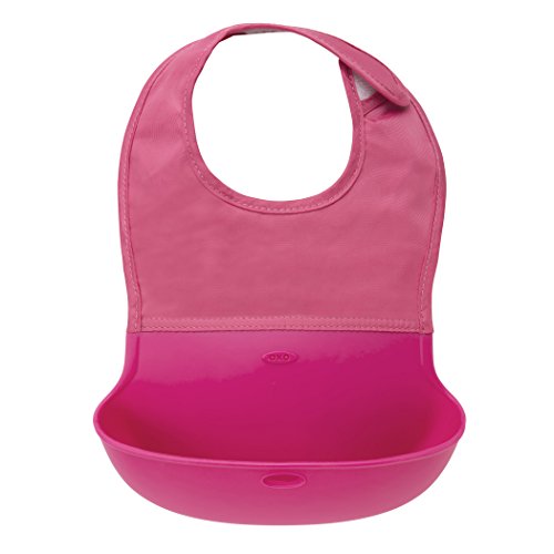 OXO Tot Waterproof Silicone Roll Up Bib with Comfort-Fit Fabric Neck, 2 Pack, Pink/Green