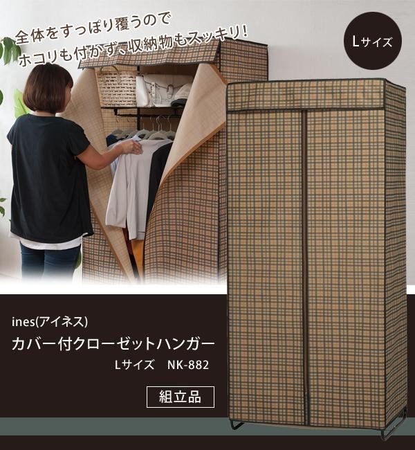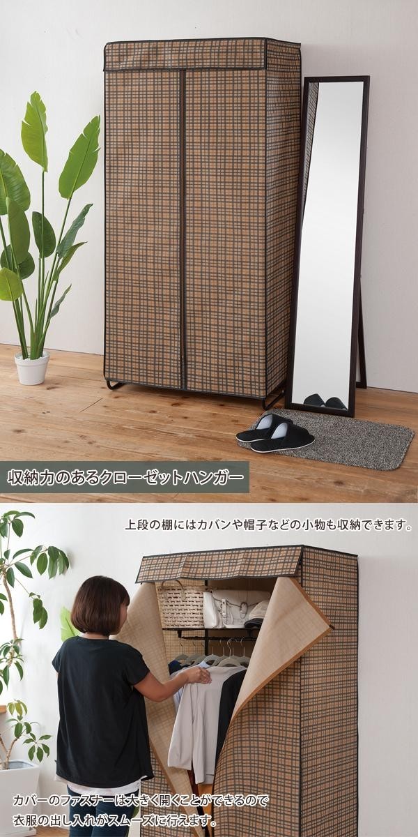 | 収納力のあるクローゼットハンガー。上段の棚にはカバンや帽子などの小物も収納できます。カバーのファスナーは大きく開くことができるので衣服の出し入れがスムーズに行えます。全体をすっぽり覆うのでホコリも付かず、収納物もすっきり隠せます。 |