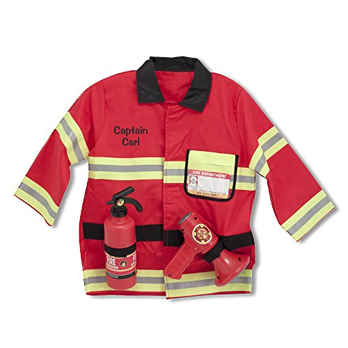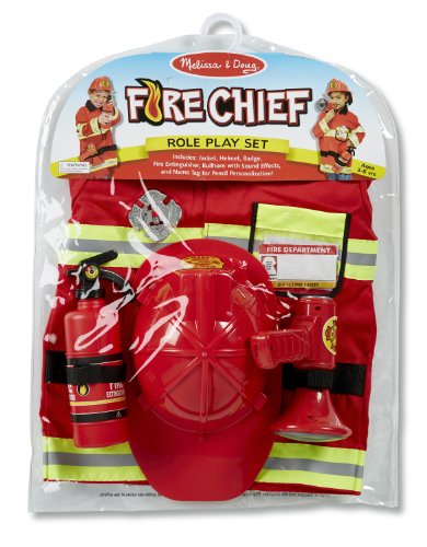 Here is everything your fire fighter needs in an emergency: a bright red, machine-washable jacket trimmed with reflective material, a fire chief helmet, a "fire extinguisher", a bullhorn with sound effects, a shiny badge and a name tag for personalizing.Feature