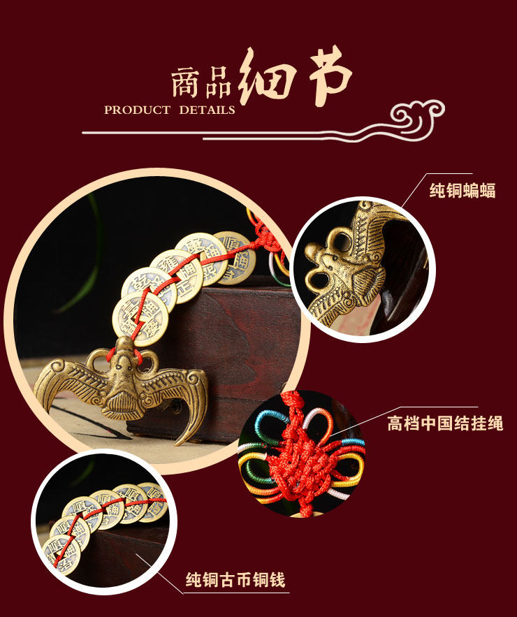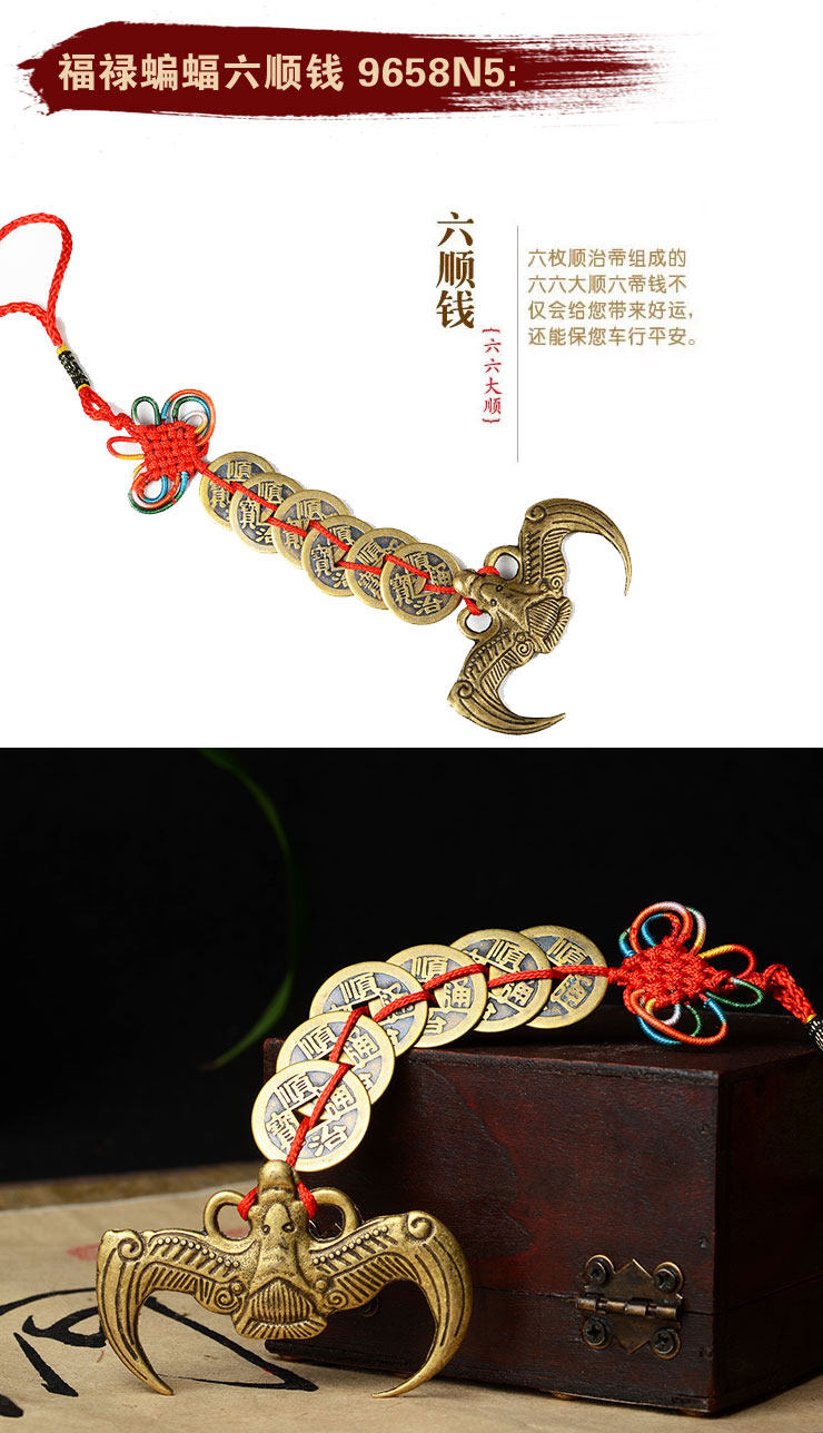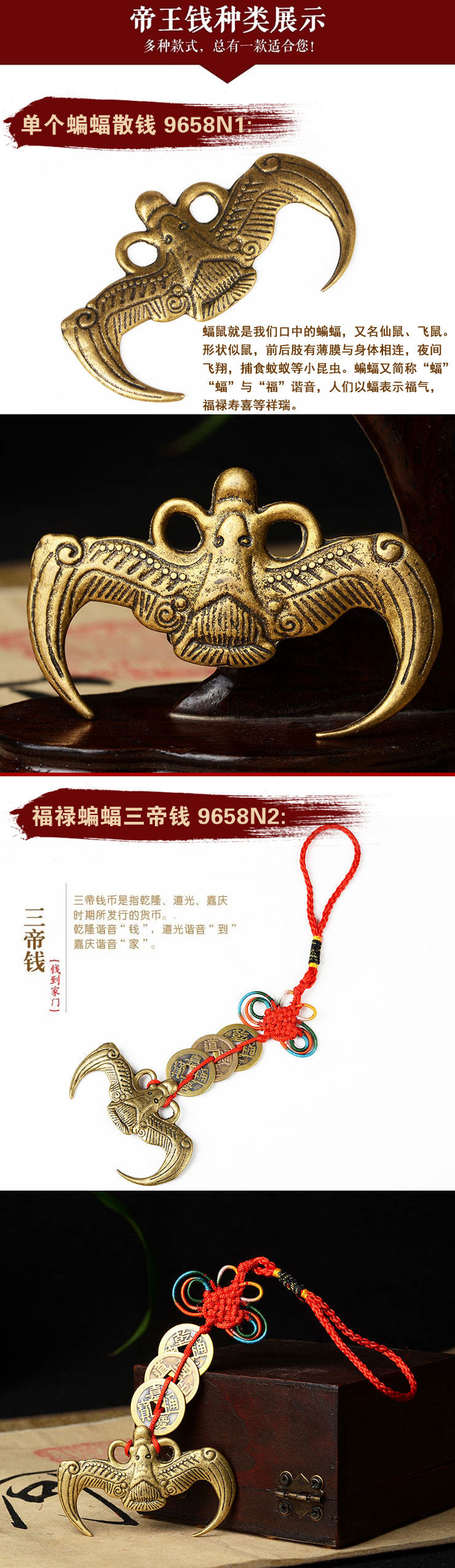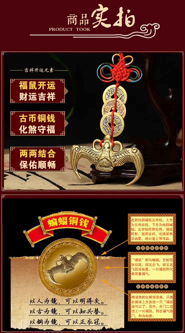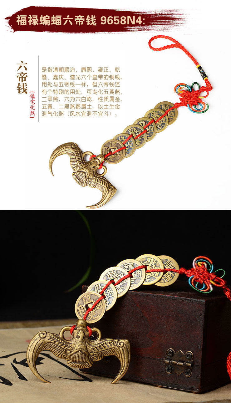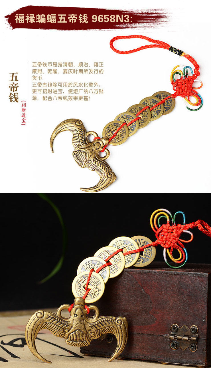| “福鼠”即为蝙蝠,它的形状似鼠,却又会飞,故又名飞鼠或仙星。一对福鼠则代表双重福气。 现今的房屋,很多都有横梁,而横梁则会造成煞气,令运气和健康变差,比如横梁压床会令人感觉疲劳,健康差;横梁压座则会令运气变差,破财等。 其实横梁煞的化解放法非常简单,只要在横梁上方各挂一只“福鼠”就可以了。 另外,在门二边挂上一对福鼠,则会福气临门,和合如意,挂五个福鼠,为五福临门只寓意 此款纯铜福鼠五帝钱,上方为五帝古钱,下方为纯铜蝙蝠,五帝钱旺财化煞,福鼠旺财、富贵吉祥,化横梁煞及凶星,绝对是上等佳品。 蝠鼠就是我们口中的蝙蝠,又名仙鼠、飞鼠。形状似鼠,前后肢有薄膜与身体相连,夜间飞翔,捕食蚊蚁等小昆虫。蝙蝠又简称“蝠”,“蝠”与“福”谐音,人们以蝠表示福气,福禄寿喜等祥瑞。 蝙蝠与鸡均为人类大医生,一者为子水,一者为酉金,当前正行八白土运,因此家家户户要补水又补金,也因此更要珍惜[蝙蝠],福与蝠同音,也与[富]同音,蝙蝠代表[书经]所讲的五福的[福],也代表有钱,以生肖而论,牛生肖最合适用蝠鼠来作生肖吉祥物。 除招福招财之外,可化泄属牛之人[死符]、[劫煞],以铜造又可化瘟神病符,一物招财镇宅,化泄流年煞。 如遇吊灯压床(压桌)或横梁压顶,但又无法移开的话,可将此物一对悬挂于吊灯上或横梁两端,可化解上述(吊灯或横梁压顶)所带来的不利。 煞分型煞和气煞。煞的种类繁多,只要你看着不顺眼的,都可认为是“煞”。气煞是你看不见的,按九宫飞星寻的煞气主要是“二黑,主病”“三碧,主纷争”“五黄,主凶祸”“七赤,主刑伤贼动官非” 铜钱属金,可泻土,就是作用在土煞上,可泻:二黑,五黄之煞气,又可泻“土”状型煞之煞气。 |