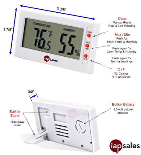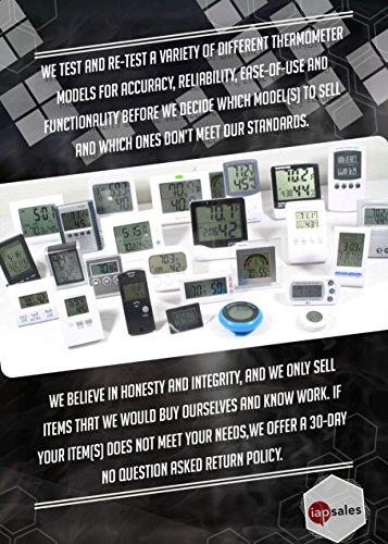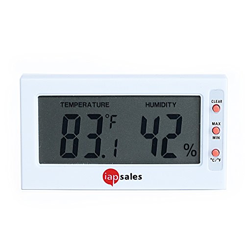 -. Brand : iapsales -. Color : White -. EAN : 0684191858963 -. Feature : MEASURES: Room Temperature and Humidity / SIMPLE DISPLAY: Large easy to read ¾" number with built-in stand for table top viewing / RECORDS MIN / MAX LEVELS: High & Low temperatures & relative humidity with a manual reset / SENSOR RANGES: Indoor Room Temp 32 to 122°F ( 0 to 50°C) & Humidity 10 to 99% RH / FULL 30 DAY MONEY BACK GUARANTEE: If you are not satisfied for *Any Reason*, JUST SEND IT BACK -. Label : iapsales -. Manufacturer : iapsales -. ProductGroup : Home Improvement -. ProductTypeName : MAJOR_HOME_APPLIANCES -. Publisher : iapsales -. Studio : iapsales -. Title : Easy to Read: Indoor Digital Thermometer and Humidity Meter. Large Digital Display Works in Celsius & Fahrenheit. Simple Temperature & Relative Humidity Monitor -. UPC : 684191858963