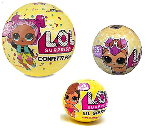 -. Binding : Toy -. Brand : L.O.L. Surprise! -. EAN : 7426834033220 -. Feature : Set Includes Surprise Confetti Pop-Series 3, Lil Sisters and Surprise Pet / Ages 4+ -. Label : MGA Entertainment -. Manufacturer : MGA Entertainment -. MPN : 1 -. PartNumber : 1 -. ProductGroup : Toy -. ProductTypeName : TOYS_AND_GAMES -. Publisher : MGA Entertainment -. Studio : MGA Entertainment -. Title : Bundle Lets Be Friends! Surprise Confetti Pop-Series 3, Lil Sisters and Surprise Pet - 3 LOL Surprises!
