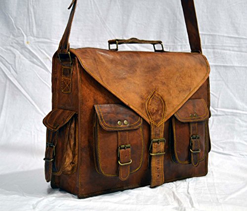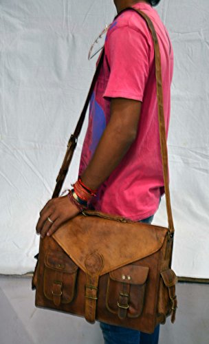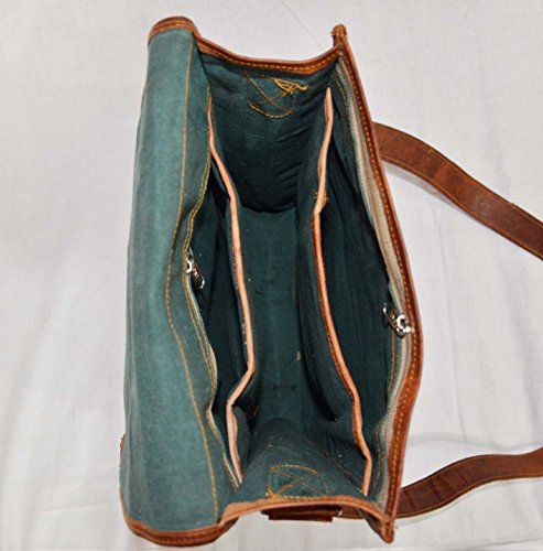 Feature : Handmade from quality goat leather, naturally tanned (not dyed) that softens and darkens with regular use. / Size (WxHxD): approximately 15x11x4 inch (perfect for documents, laptop / notebook, netbook or iPad) / Strong brass polished buckles, rustproof. / Adequately long and adjustable leather shoulder strap / lovely green lining canvas and use as a office bag laptop bag leather messenger satchel laptop bag