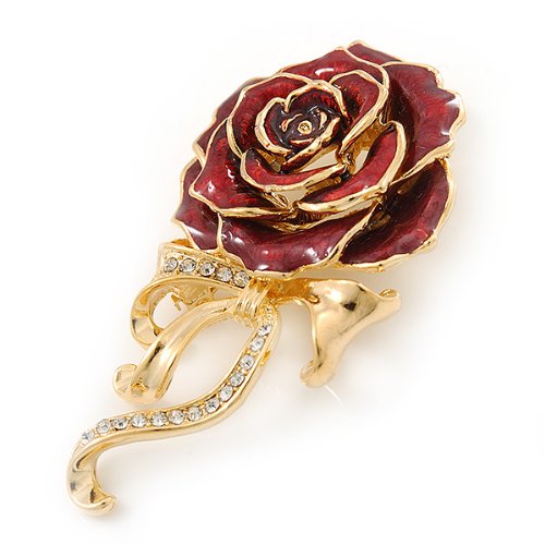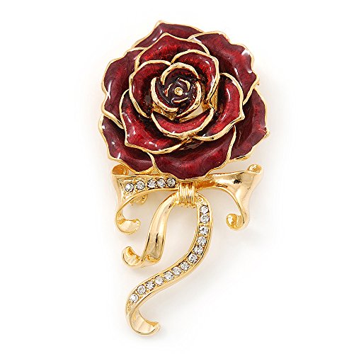 -. Title : Burgundy Red Enamel Rose With Crystal Bow In Gold Plating - 65mm Length