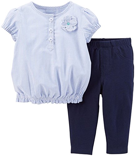 -. Binding : Apparel -. Brand : Carter's -. Color : Blue -. Department : baby-girls -. Feature : Top features rosette appliqué, front button placket and cinched hem and cuffs / Top: 100% cotton sheeting; leggings: 95% cotton, 5% elastane / Pants feature no-pinch elastic waistband / Set includes short-sleeve cotton top and stretch leggings -. ProductGroup : Apparel -. ProductTypeName : PANTS -. Title : Carter's Baby Girls' 2 Piece Cotton Top & Legging Set - Blue