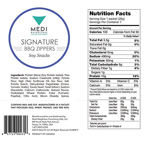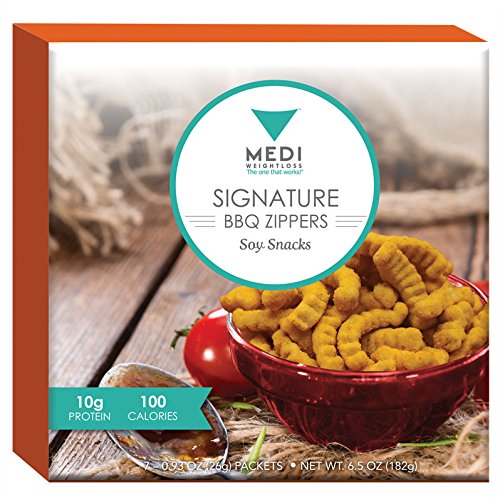 -. Binding : Misc. -. Brand : Medi-Weightloss -. EAN : 0857723004279 -. Feature : All The Flavor With Only 100 Calories Per Serving, Zippers Are Fully Seasoned and Delightfully Crunchy. / Versatile, Enjoy These Potato Chip Alternatives Right Out Of The Bag Or Use As Breading Or To Thicken Soups. / Great For Hunger Control During Diet/Weight Loss. / Zero Trans Fat And Cholesterol. / 10g Protein Per Serving. Box Includes 7 (0.93-Ounce) Bags. Contains Soy Protein. -. IsAdultProduct : 0 -. Label : Medi-Weightloss -. Manufacturer : Medi-Weightloss -. PackageQuantity : 7 -. ProductGroup : Grocery -. ProductTypeName : GROCERY -. Publisher : Medi-Weightloss -. Studio : Medi-Weightloss -. Title : Medi-Weightloss BBQ Zippers Snacks, High Protein (10g), 100 calories - 7 Packs Per Box -. UPC : 857723004279