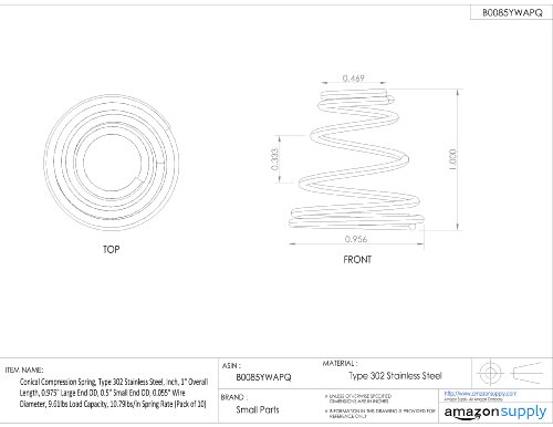 Conical Compression Spring, Type 302 Stainless Steel, Inch, 1" Overall Length, 0.975" Large End OD, 0.5" Small End OD, 0.055" Wire Diameter, 9.61lbs Load Capacity, 10.79lbs/in Spring Rate (Pack of 10)