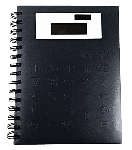 -. Feature : Built-in calculator with easy-to-use debossed keys / Includes AG12 battery / Notebook has 80 lines sheets / 8" L x 6" W / Color: Black