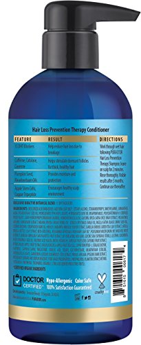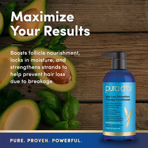 Pura d'or hair loss prevention therapy conditioner is formulated to work in synergy with our hair loss prevention shampoo for optimal results. Caffeine, catalase and cayenne help stimulate dormant follicles for healthy thick hair. Apple stem cells encourage healthy scalp environment. Amla and meadow foam oils provide moisture and protection. Dr trusted. Hypo-allergenic. Cruelty free. Made in the usa. Color safe.