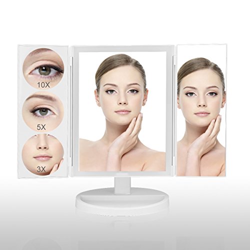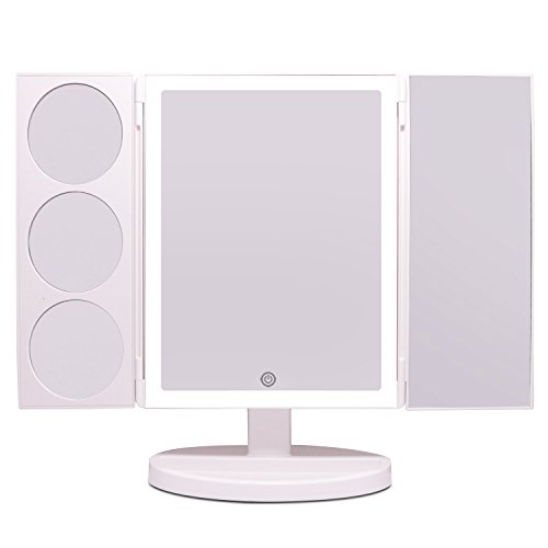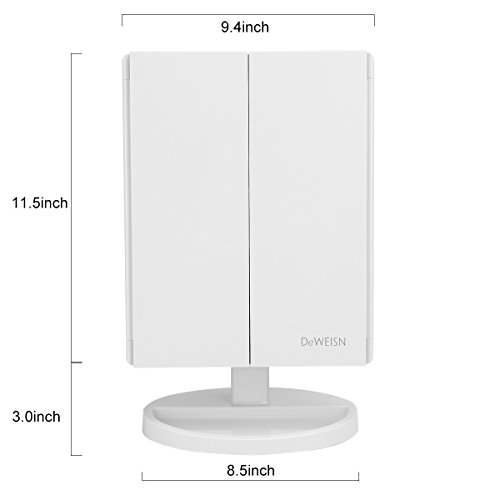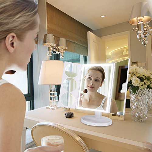 Product Description Color:White Mirror Features: Sleek look and 3x/5x/10x magnification. So convenient to take with you to anywhere,in the pub or car or the darkness, Lighted makeup mirror can help you makeup any time. Base recess can hold Jewellery cosmetics:earrings, bracelets, etc. Perfect gift for ladies and girls in Holiday Days, Birthday, Party, Special occasions etc. Specification: * 3x/5x/10x Magnifying * Frame material: ABS * Product Size: 14.5*9.4*5.9 inch-- The entire height is 14.5" tall. Middle mirror is 11.8"x 9.4"and Double Side Mirror Dimension is 11.8"x 4.6" * Net Weight:1.4kg * 180 degrees rotation. LED lights: 44pcs LEDs, high brightness LED control: Touch Screen ON /Off Power: USB chargeable or 4pcs AAA battery powered (battery not included) Voltage: Only fits with power adapter DC5V/0.5A-1A-2A or you can connect with your other devices like PC, power bank with standard usb interface. Switch: touch switch , when you do not need it, pls turn off to save electricity. Power Control: On/Off button located on the back of mirror. We are concerned about every customer, if you have any questions, please don't hesitate to contact us. Package Include: 1x Mirror 1x USB Cable 1x User manual Cleaning cloth Please Note 1.Before touch the sensor switch to turn the light on, please make sure the ON/OFF button located on the back of the mirror is in the ON position. 2.Do not power it by USB charging and battery at the same time. . 3.When you don't need it, please turn off touch switch to save electricity. 0 |