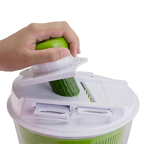 In addition, this set includes a mandolin slicer lid with three inter-changeable stainless-steel blades to grate, shred and slice vegetables, fruits or cheese right into your salad. The safety food holder protects hands and covers blade when not in use. Hand washing recommended for extending the life of the product but it is top rack dishwasher safe. This spinner is a versatile addition to your professional kitchen collection.