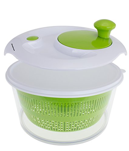 Simply rinse your greens, fruits or vegetables in the removable colander, spin it with the easy to turn one-handed knob, pause the spinning with the quick stop button, drain, and finish preparing the salad right in the BPA-Free bowl. This salad spinner makes it effortless to bring fresh healthy salads to your table with its stylish design featuring an elegant, non-slip clear bowl that doubles as a food-safe serving dish. A flat, stackable storage lid is included to keep vegetables fresh in the refrigerator.