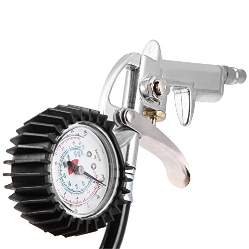 -. Feature : Keep your tires properly inflated with the Air Tire Inflator with Gauge. It combines an inflation gun, chuck and gauge in one easy-to-use tool, and it comes with a flexible hose for easy use. / This handy gadget can help increase the life of your tires, saving you both time and money. / It is exceptionally easy to use. Just position the chuck on the tire stem, pull the lever on the chuck, and fill. / If you wish to keep a record of the pressure result, the gauge will keep the pressure rating when you remove the chuck from the stem, and then it will clear the reading when you touch the reset button. / Inflation gun, chuck, and gauge are all combined in one easy to use unit