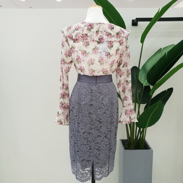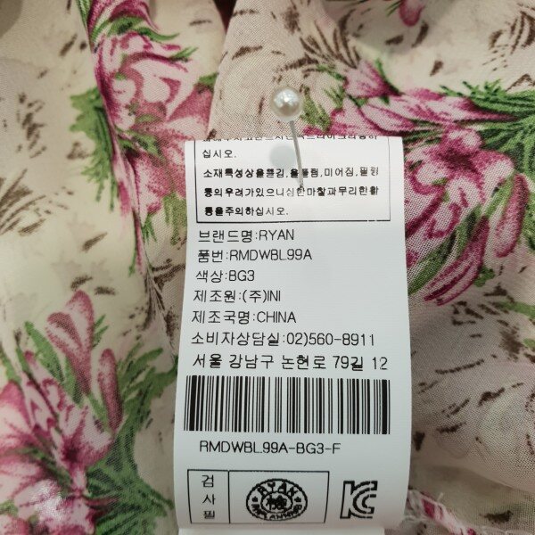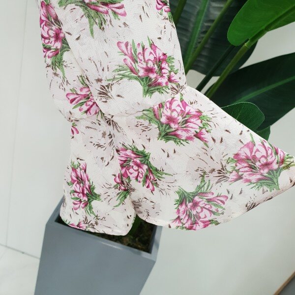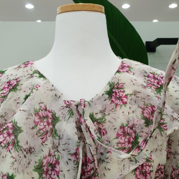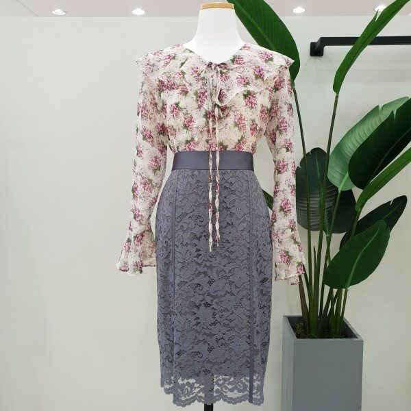 핑크색 꽃무늬가 러블리한 쉬폰 프릴 블라우스입니다~ 소매도 트럼펫 슬리브 라서 더욱 여성스러운 상품입니다~