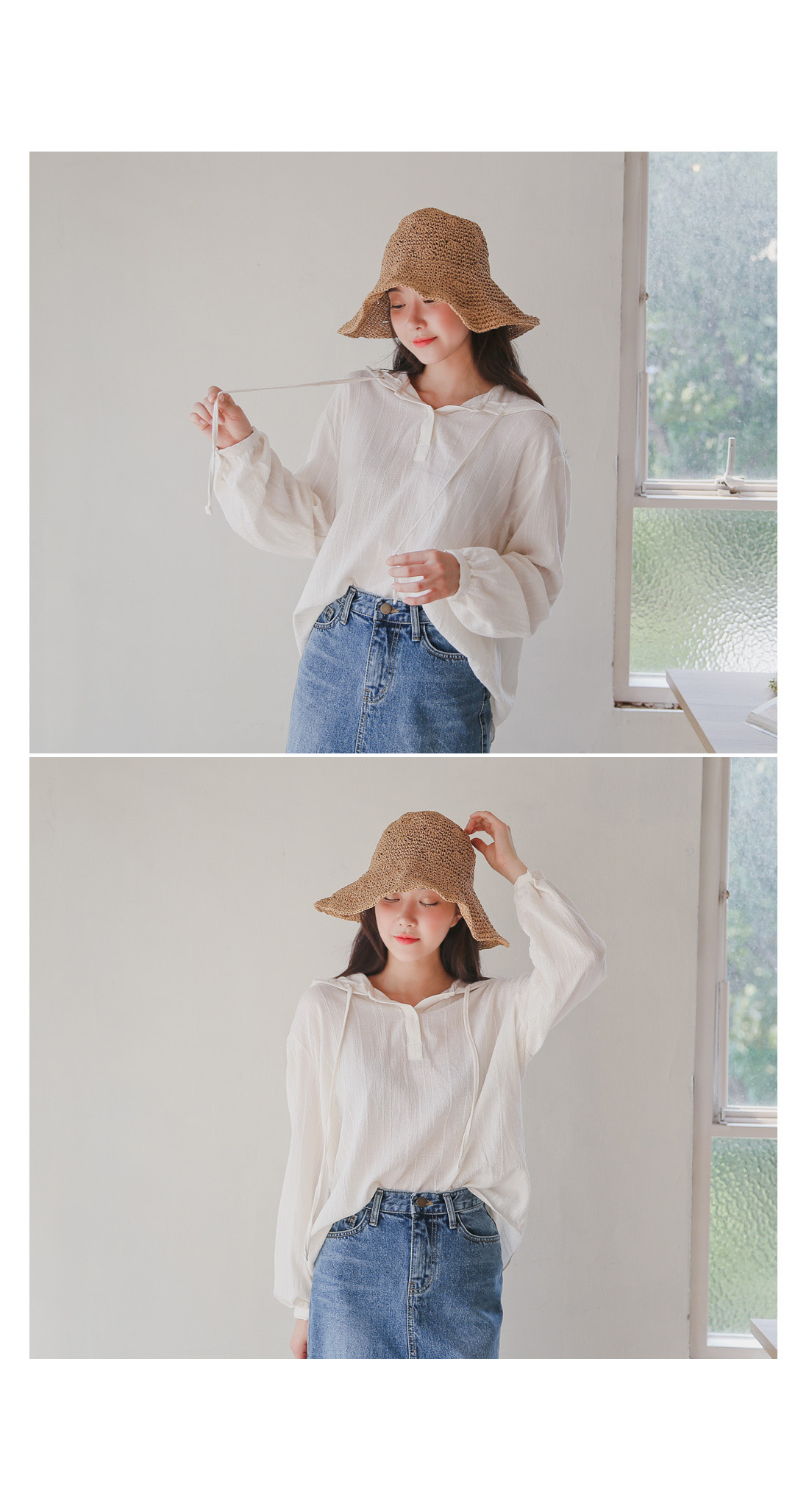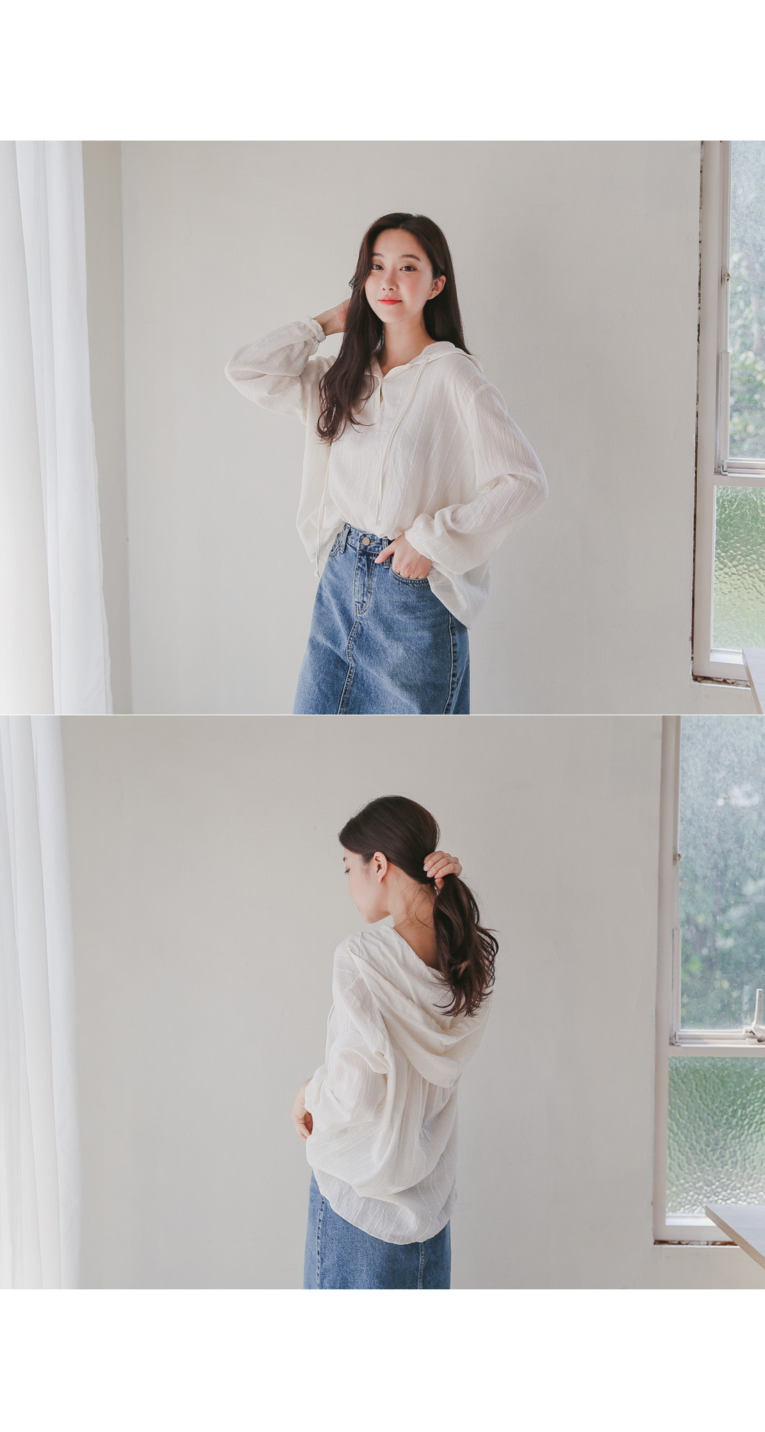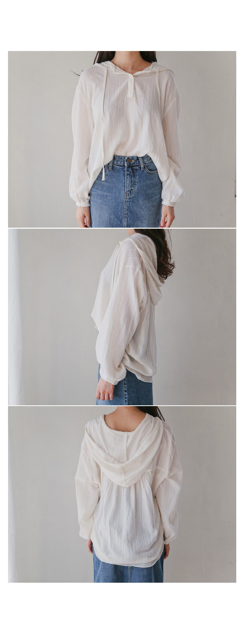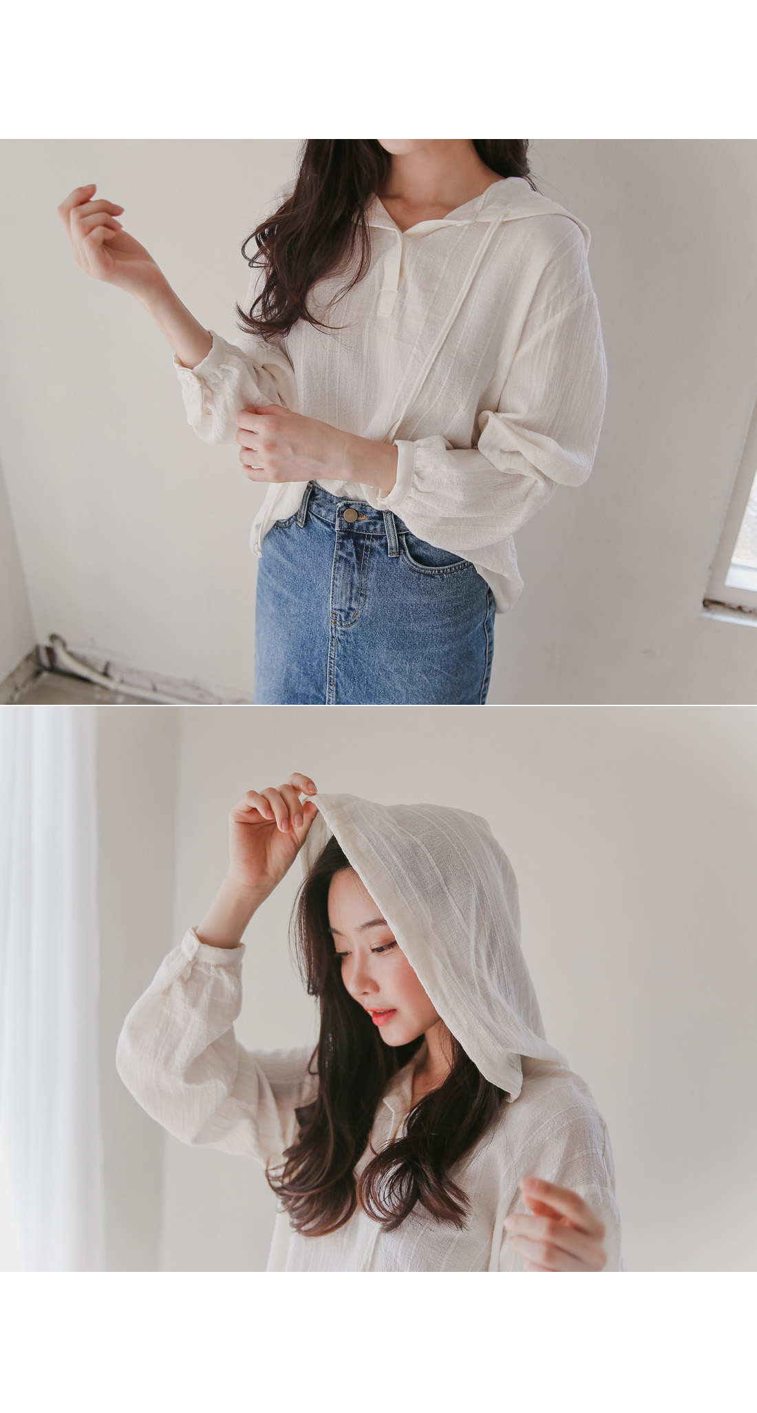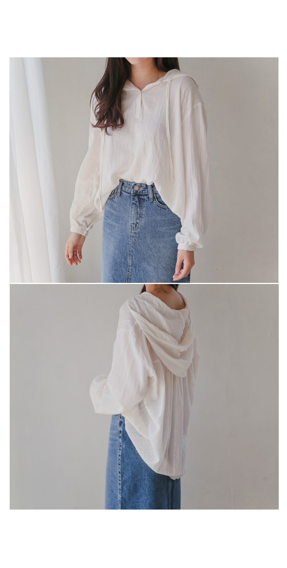 캐주얼한 무드로 착용하기 좋은 거즈후드블라우스!