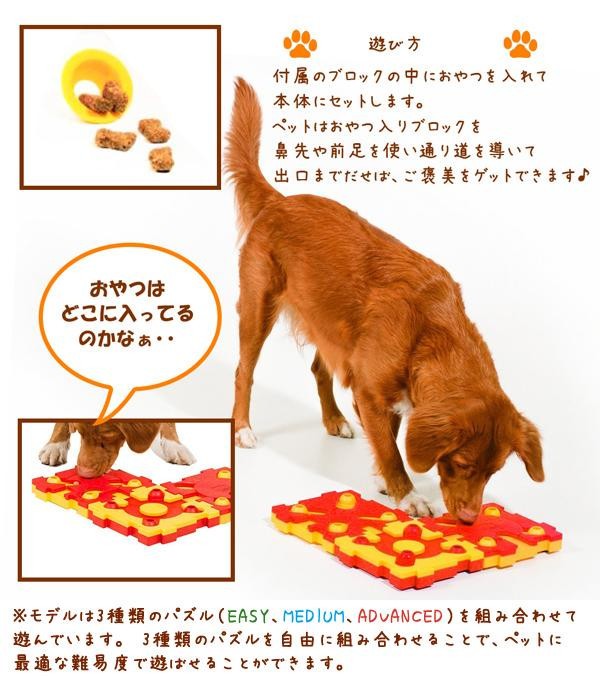 | 隠されたご褒美を夢中で探すパズルゲームで、ペットが楽しく遊びながら学習できます。付属のブロックの中にセットされたおやつを、鼻先や前足を使って出口まで導けばご褒美ゲット!!食べ終わったらほめてあげて下さい♪ |