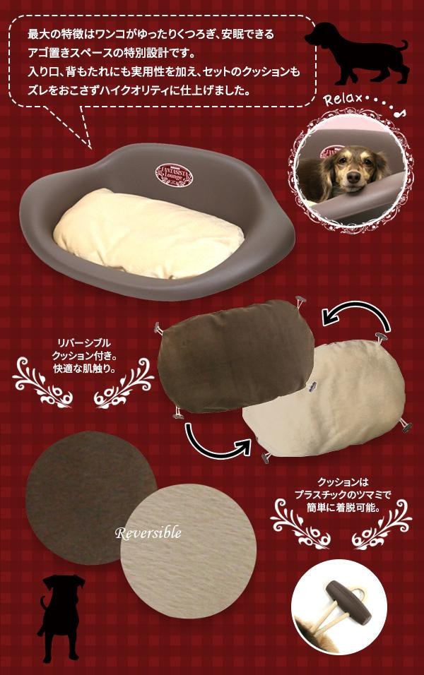 ワンコがゆったりくつろぎ、安眠できるアゴ置きスペース付きペット用ベッド♪クッションは肌触りがよく、手洗いができるので衛生的にお使い頂けます。 |