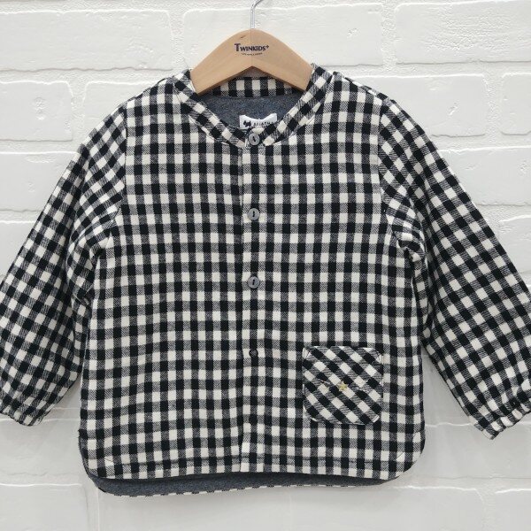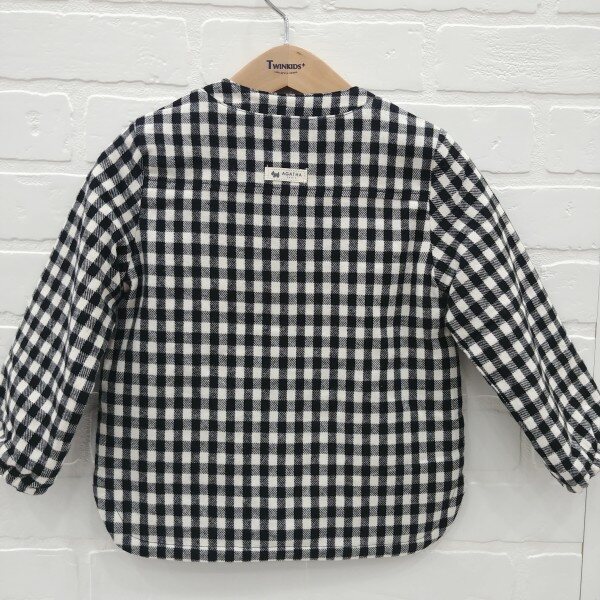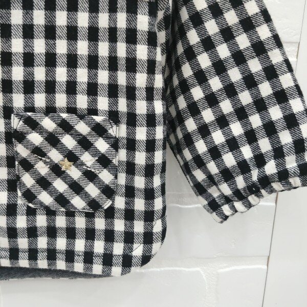 기모감 있는 면 선염 체크원단을 사용한 패딩셔츠, 패딩 충전재를 넣어 보온성이 좋음. 표정자수로 포인트를 준 스타일.