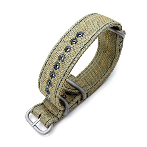 -. Feature : Shipping Estimate: 7 - 10 Business Days within US. / Material: Washed Canvas / Color / Stitching: Khaki / Blue / Hardware finish: Sandblasted / Design to fit : 22mm lug width watch, lug & case space bigger than 2.8mm