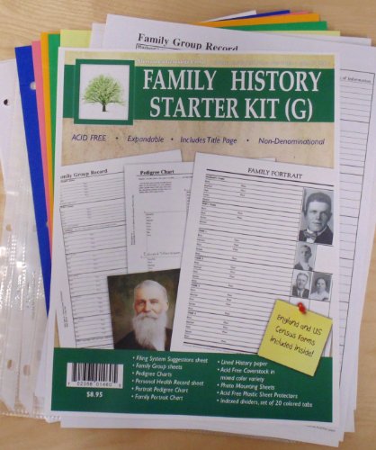 Starter kits include 20 colorful preprinted index dividers, 5 sheet protectors, and 50 sheets of new genealogy forms including: family group sheets, pedigree charts, photo charts, and much more.