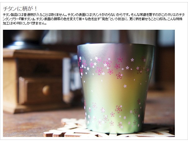 チタン製品には普通柄が入ることはありません。チタンの表面にはプリントがのらないからです。そんな常識を覆すのがこのホリエのチタンタンブラー『華チタン』。チタン表面の膜厚の色を変えて様々な色を出す"発色"という技法に、更に柄を載せることに成功。こんな特殊加工はHORIEにしかできません。