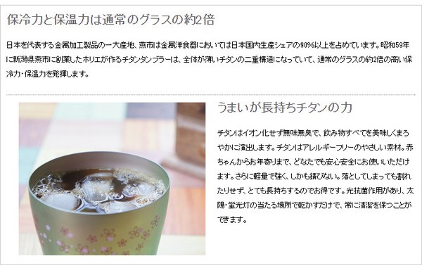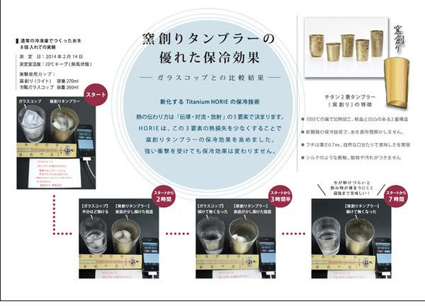 日本を代表する金属加工製品の一大産地、燕市は金属洋食器においては日本国内生産シェアの90%以上を占めています。昭和59年に新潟県燕市に創業したホリエが作るチタンタンブラーは、全体が薄いチタンの二重構造になっていて、通常のグラスより高い保冷力・保温力を発揮します。