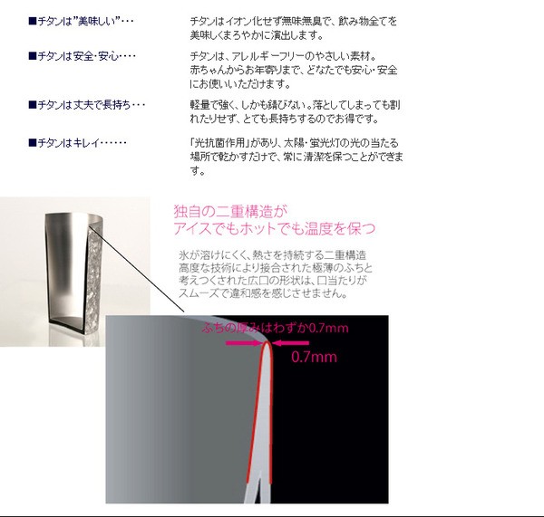 チタンはイオン化せず無味無臭で、飲み物すべてを美味しくまろやかに演出します。チタンはアレルギーフリーのやさしい素材。赤ちゃんからお年寄りまで、どなたでも安心安全にお使いいただけます。さらに軽量で強く、しかも錆びない。落としてしまっても割れたりせず、とても長持ちするのでお得です。光抗菌作用があり、太陽・蛍光灯の当たる場所で乾かすだけで、常に清潔を保つことができます。飲み口部分は口当たりが良いように薄く広口に作られ、高度な加工技術から生まれたものです。