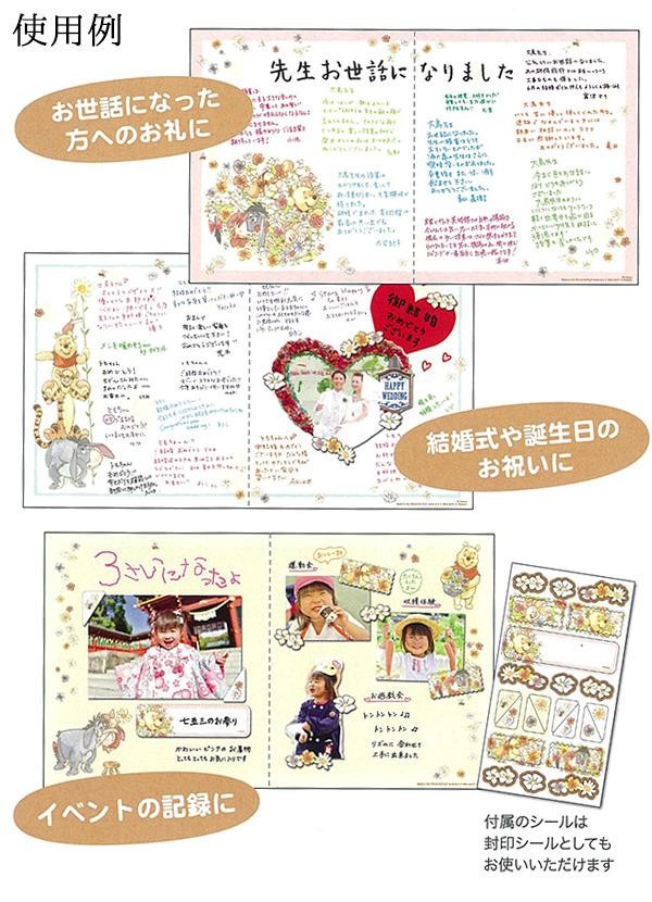 プーさんがデザインされた優しい色合いの寄せ書きブック。写真や付属のシールを使って自由にアレンジ!!見開き3ページあるのでたっぷり書き込めます。絵本のような堅い表紙がついているので、保管にも便利です♪ |