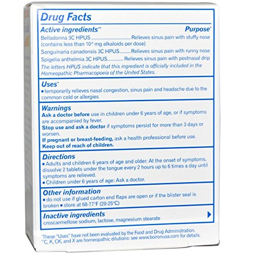 Studio : BOIRON Publisher : BOIRON Binding : Health and Beauty Product Description Description Temporarily relieves nasal congestion sinus pain and headache due to the common cold or allergies Sinusalia works naturally with your body to temporarily relieve nasal congestion sinus pain and headache due to the common cold or allergies. It does not cause drowsiness or interact with other medications. Recommended for everyone ages 6 and up. - Non-drowsy; No drug interactions. - For everyone ages 6 and up. - Works naturally with your body. These statements have not been evaluated by the Food and Drug Administration (FDA). These products are not meant to diagnose, treat or cure any disease or medical condition. Please consult your doctor before starting any exercise or nutritional supplement program or before using these or any product during pregnancy or if you have a serious condition. 0