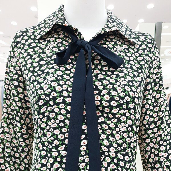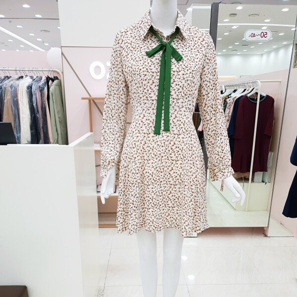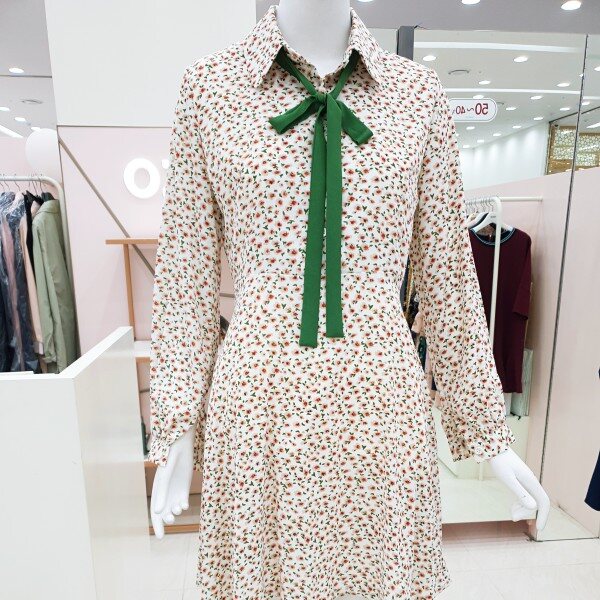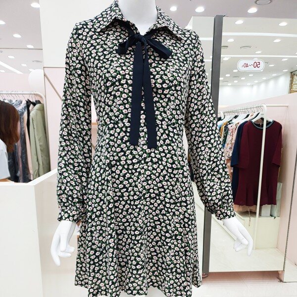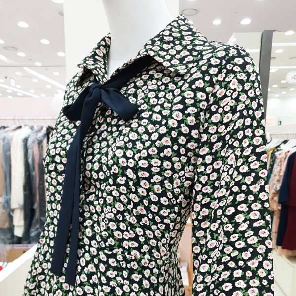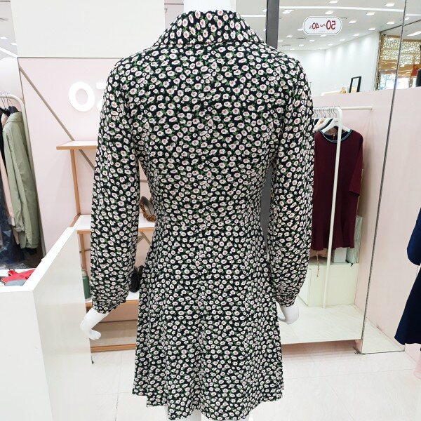 자잘한 꽃무늬에 무릎 바로위 길이감에 플에어스커트 느낌으로 발랄한 느낌을 주는 원피스입니다