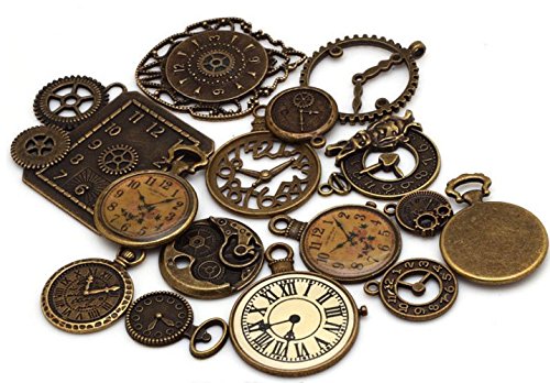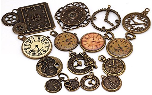 15 Pc Antiqued Charm Lot - Clock Face, DIY Crafts, Gears, Jewelry Making, Steampunk Pendants (As Pictured)